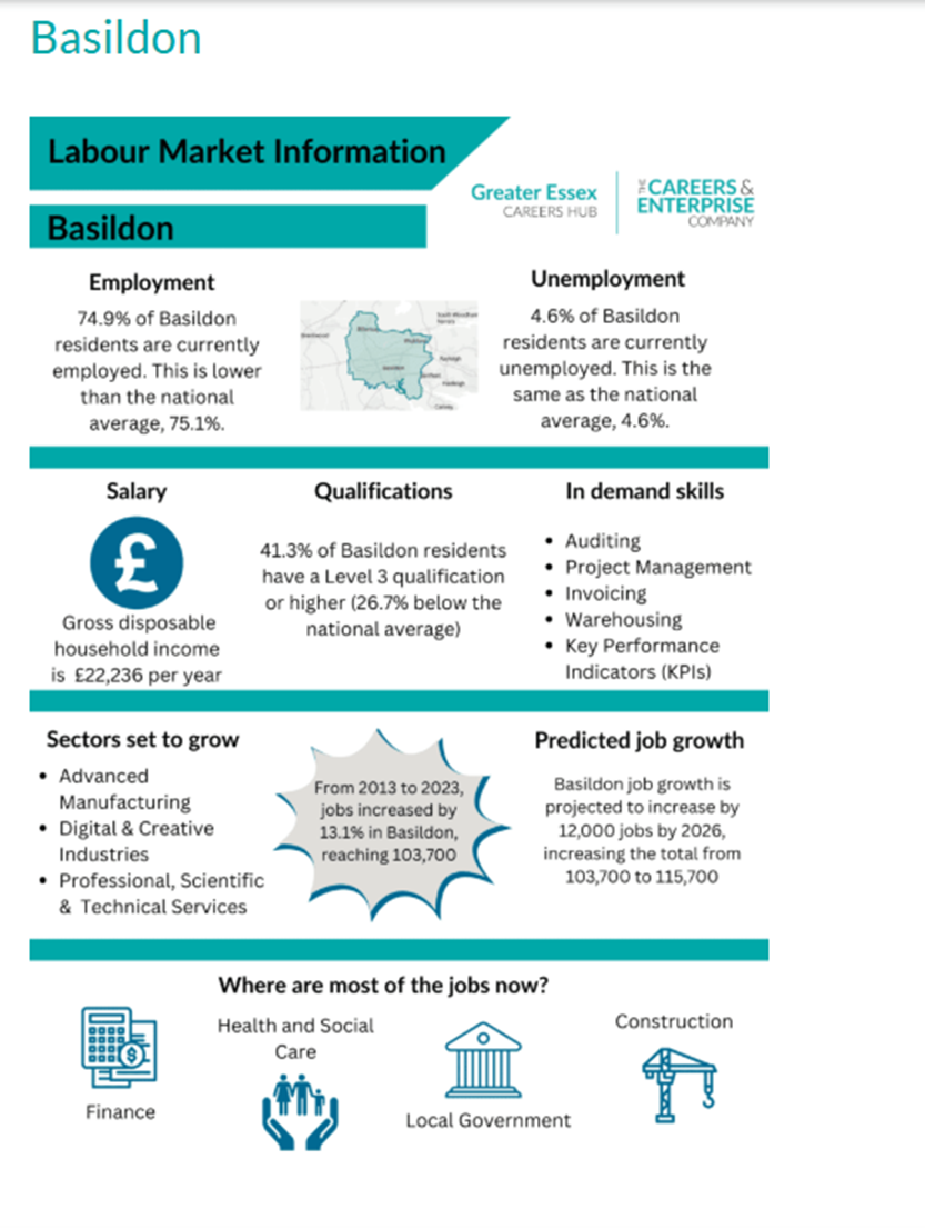 As part of your careers research, you should be aware which job areas will have the most opportunities and which areas may be in decline. This information is called Labour Market Information (LMI) and also covers the average salaries for each type of job. The following infographic is the latest LMI to be released for the Basildon area.